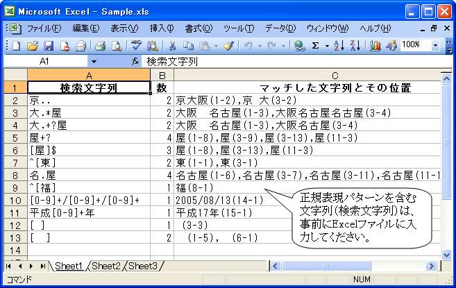 検索文字列は、事前にExcelファイルに入力します。使用度数は同一のExcelファイルに一括して出力されます。 また、正規表現で文字列を指定した場合には、マッチした文字列とその位置(行と桁数)も出力します。