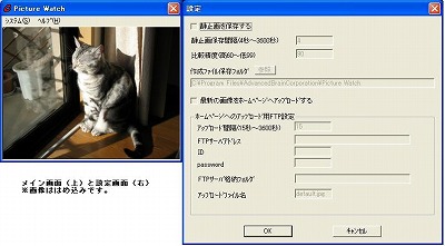本アプリケーションは、Webカメラを使用して被写体に変化がある場合に静止画を保存するソフトウェアです。最新の静止画をFTPサーバにアップロードすることも可能ですので、携帯電話等からでもカメラ画像を監視できます。