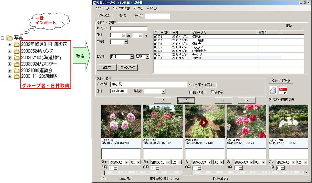 画像をグループ単位で管理し、日付、グループ名で検索・表示が可能な写真のビューアです。