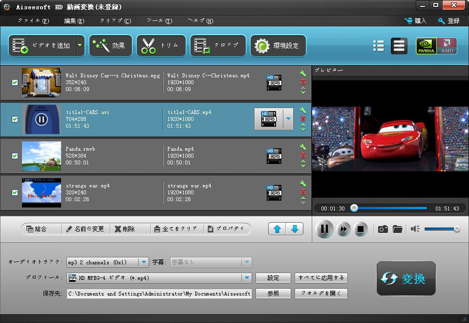 Aiseesoft HD 動画変換は最高なHD変換ソフトで、HDビデオを普通のビデオに、普通のビデオをHDビデオに、HDビデオの間に変換できるだけでなく、最新アップデートされ、4K動画を変換することもできるようになります。例えば、HD TS、HD MTS、HD M2TS、HD MPEG、HD WMV、HD MPG、HD MP4、QuickTime HD MOV、HD H.264、HD RMビデオなどを変換できます。