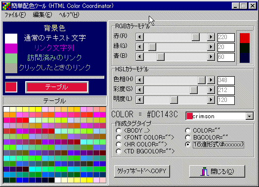 「簡単配色ツール」はHTMLタグの配色設定ツールです。実際に色を確認しながら指定が出来るのでいちいちブラウザで確認しなくて済みます。
