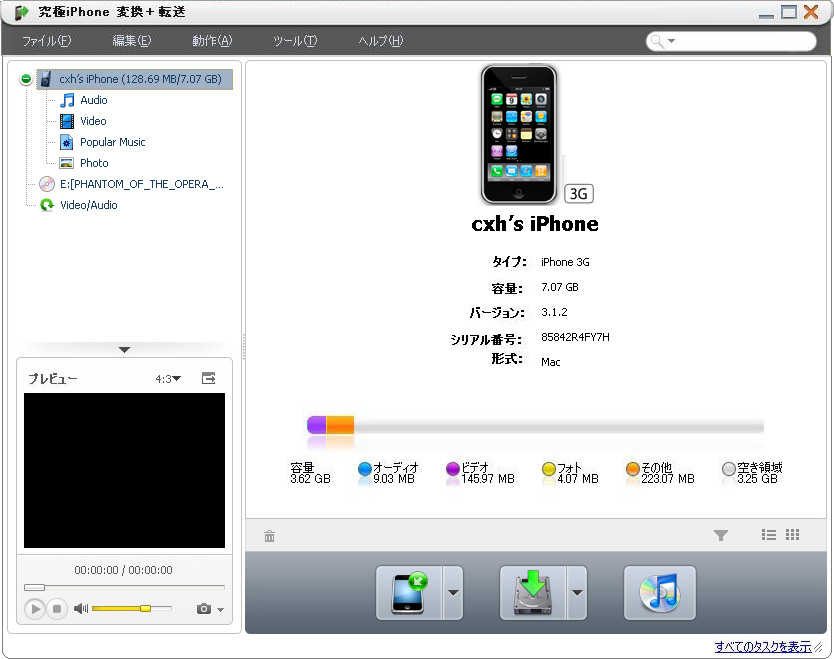 究極iPhone 変換+転送はiPhone全機種(iPhone、iPhone 3G、iPhone 3GS、iPhone 4)及びiPod touchに対応しています。ファイルの転送機能を持つ他、究極iPhone 変換+転送でiPhoneをポータブルハードディスクとして管理することも可能です。