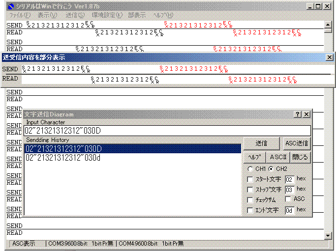 送信文字と受信文字がラインモニターのようにわかりやすい表示である。