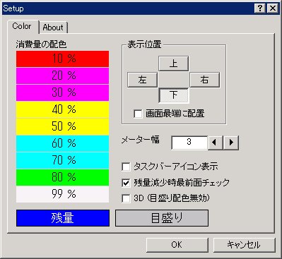 起動すると画面の端にバッテリメータを表示します。 メータの上にマウスカーソルを移動させると残量が表示されます。