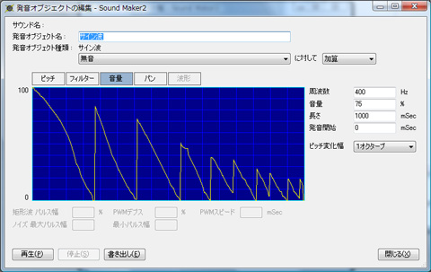 ソフトウェアシンセサイザの原理を応用した、効果音素材作成ソフトです。 グラフをマウスでぐりぐりと描き、さまざまな効果音を作ることができる、まさに、描く効果音素材作成ソフトと言えます。