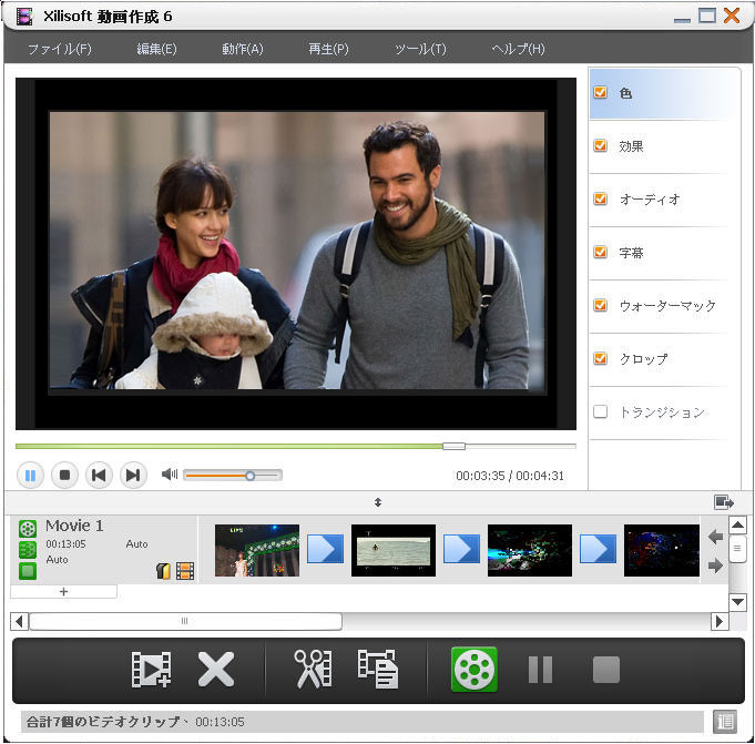 Xilisoft動画作成で動画をムービーリストにドラッグ&ドロップするだけで簡単にムービーを作成できます。さらに、このムービー作成ソフトでは字幕とウォーターマークの追加、トランジョンの適用、動画イメージの変更、音楽の追加やトリミングなどのムービー編集機能も搭載され、ムービー編集を簡単に行えることができます。今すぐ、動画作成をダウンロードし、自由自在かつ簡単なムービー作成やムービー編集を体験してみてください。