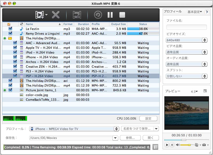 - iPhone、iPod、PSP、PS3、Archos、Zenなどのディバス用動画に変換することができます。