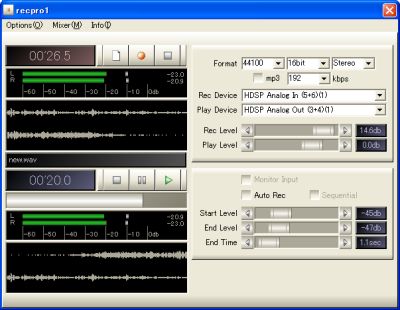 wavファイルに直接書き込んでゆくので録音終了時にファイル処理を行いません。 AutoRecをオンにすると、StartLevelを超える入力レベルがあったときに録音を開始して、 EndLevel以下のレベルがEndTime以上続いたときに録音を停止します。Seqentialをオンにすると入力検知録音を連番ファイル名で行います。
