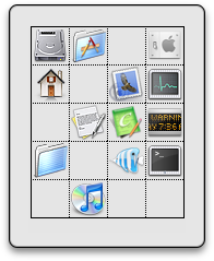Mac OS X 10.4のDashboard ウィジェットです。ドラッグ&ドロップで登録し、クリックで開くシンプルなパレット型ランチャーです。マスの数は最大10x10まで増やせます。登録した項目を除去するにはコンテクストメニューから「消去」を選んでください。