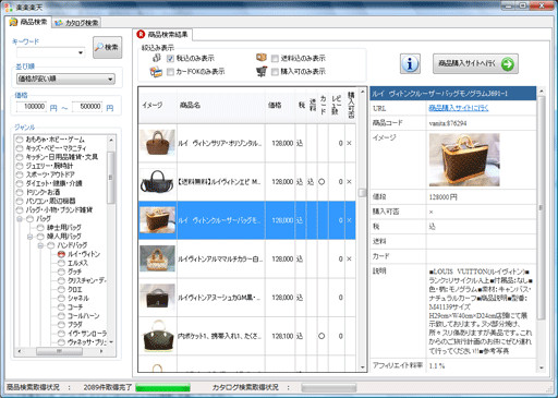 楽天商品の検索結果一覧をクリックすると、右側の詳細ウィンドウに商品の詳細が簡易表示されウィンドウショッピング感覚で楽天商品を次々に参照可能です。