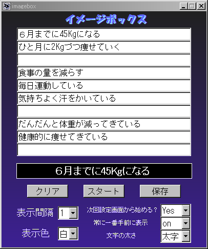 理想の自分のイメージを高速表示する事により、潜在意識に理想の自分のイメージを浸透させ自分自身を自由にコントロールする、サブリミナル効果を利用した自己暗示ソフトです。