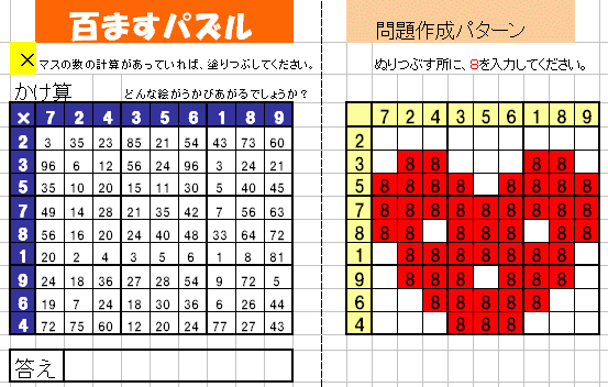 百マス計算をすると、絵が浮かびあがるパズルを作成します。 足し算、掛け算、引き算、工夫次第ではいろんな問題が作成できると思います。 印刷して教室に持っていけば、子供たちの意欲向上まちがいなしです。