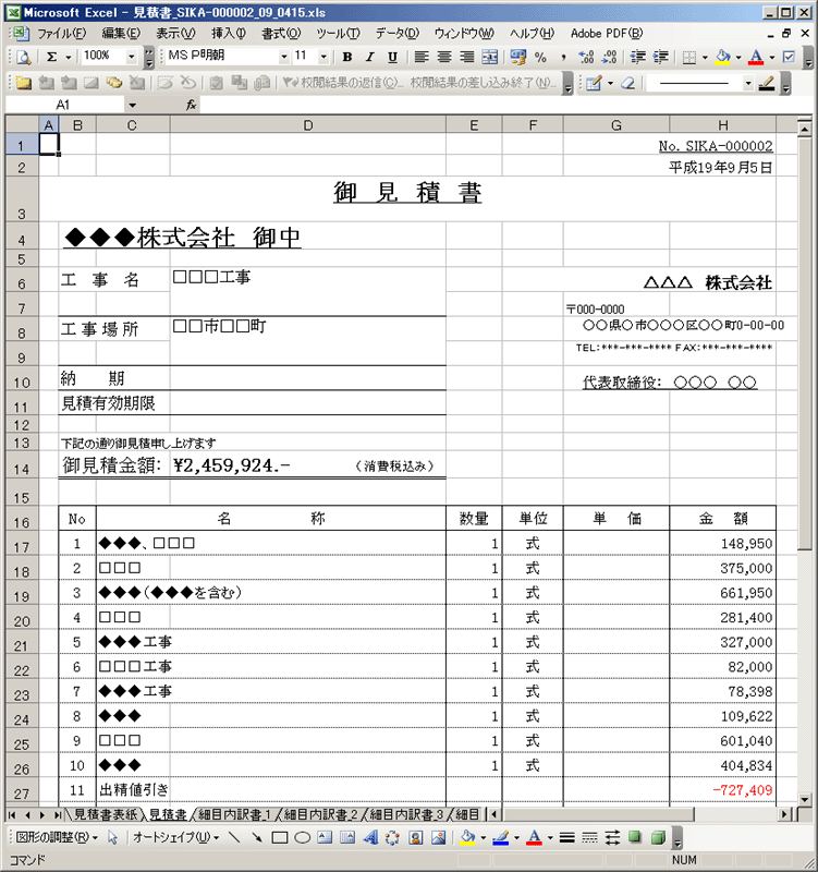 【工事一覧/見積書表紙/見積書/細目内訳書/納品書/エクセル出力機能】