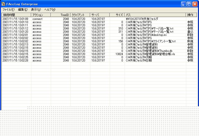 収集可能なアクセスは「参照」「書込」「リネーム」「削除」とセキュリティを網羅する内容となっておりまた、FAccLog Ultimateを導入することで、ユーザの一連操作に関連付けられたTREE IDから、ログインしてログアウトまでの間に行ったアクセス情報が簡単に抽出が可能です。