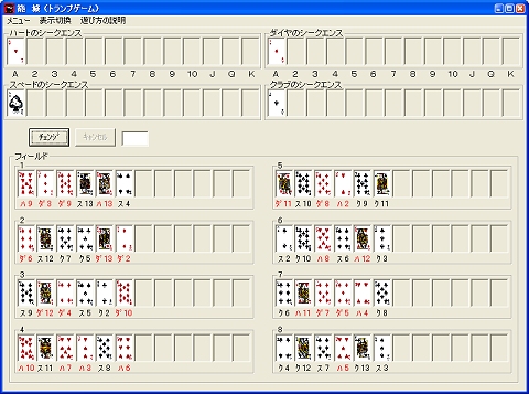 フィールド1~8にあるトランプカードを、上の4種類(ハート、ダイヤ、スペード、クラブ)のシークエンス枠のA(エース)に続けて並べて、4種類すべてのシークエンスを完成させてゆくゲームです。