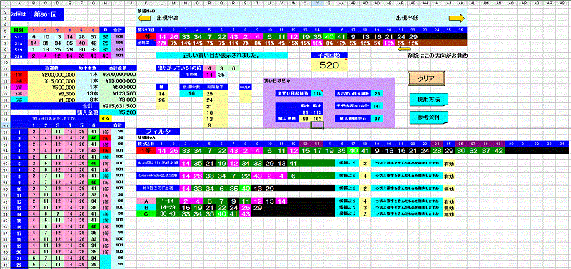 このExcelシートは、Loto6の予想支援と買い目の作成、カードの印刷が可能。