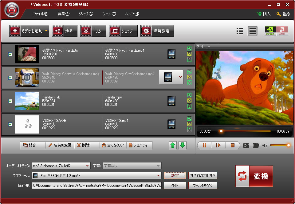 *TOD、MOD、MOV、MKV、MP4、MPG、HD TS、HD M2TS、HD MTSなどの動画ファイルを変換する