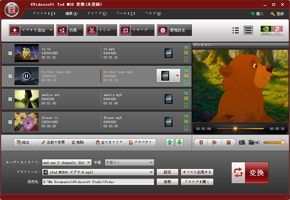 4Videosoft TOD MOD 変換はMOD、TOD、MPEG動画ファイルをMP4、MP4 AVC、WMV、AVI、FLV、3GP、MP3、MP2、M4A、WMA、WAV、OGGなどほとんどの流行っている動画・音声形式に変換できる専門的な変換ツールです。そして、iPod、iPhone、Zune、PSP、BlackBerry、Creative Zenなどほとんどのポータブルプレイヤーで楽しめます。