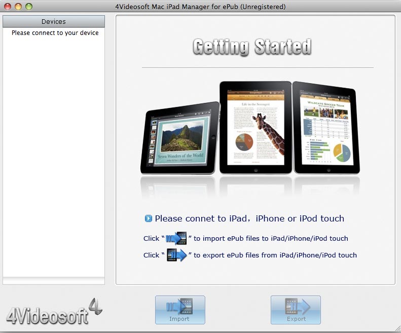 4Videosoft Mac iPad マネージャー for ePubは特にePubファイルを転送する必要があるユーザーのためにデザインされた専門的なMac iPad ePubファイル転送ソフトウェアです。このソフトはePubファイルを自由にiPadとMacの間で転送できます。それに、PDFファイルをiPadとMacの間で転送することも可能になりました。