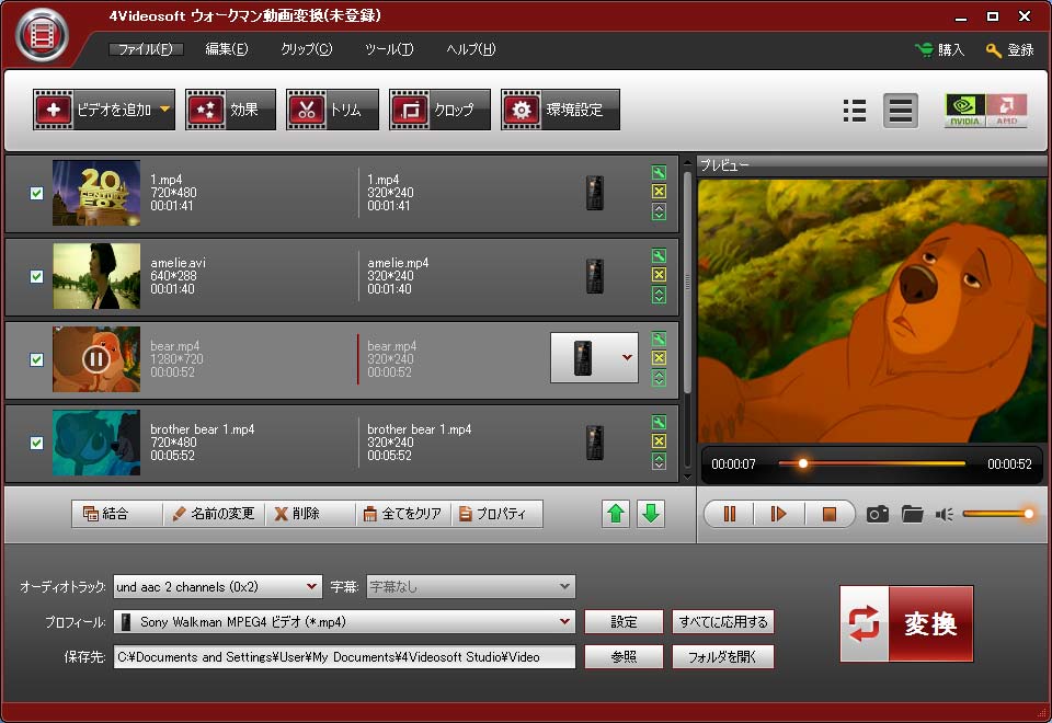 4Videosoft ウォークマン動画変換は専門的なSony Walkman変換ソフトとして、ほとんどの動画ファイルをウォークマン用のMP4、MP4 AVC(.mp4)などの動画ファイルとMP3、M4A、WAV、WMAなどの音声ファイルに変換できます。Sony Ericsson Walkman phone、Walkman Bean、Walkman Buzz、Walkman Fitness、Sony XPERIAなどすべてのSony Walkmanプレイヤー、更にPSP、PS3などにも適用します。