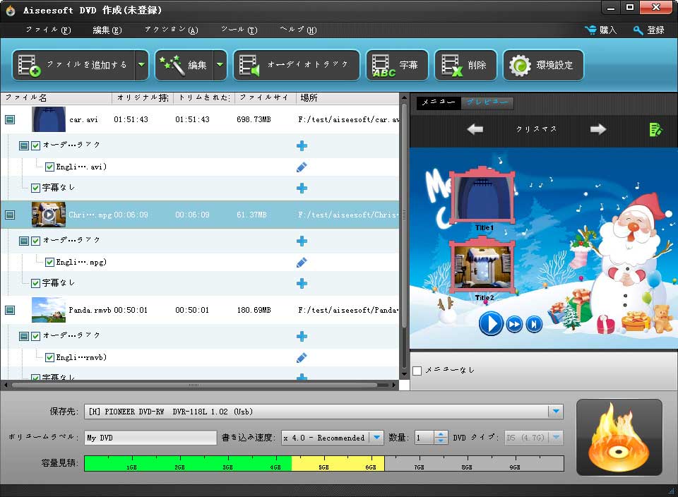 Aiseesoft DVD 作成はユーザーにベストなソリューションを提供し、DVDディスクに書き込むことにより、任意のビデオを保存できます。この不思議なビデオDVD作成を使い、ユーザーが簡単に AVI、MPEG、DivX、DV、VOB、WMV、MP4などすべての流行っているビデオをDVD-フォーマットディスク、 DVDフォルダまたはISOファイルに変換できます。このDVD作成により、DVDプレーヤーでカメラによって記録された貴重な瞬間を楽しむことができます。