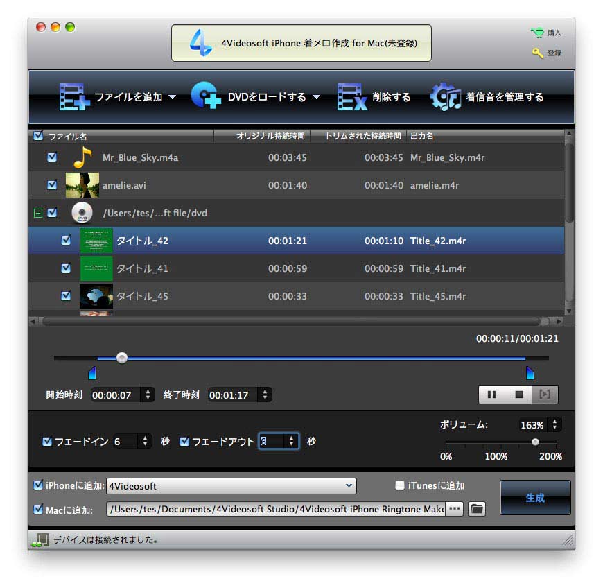 4Videosoft iPhone 着メロ作成 Macは特にiPhoneユーザーのためにデザインされた素晴らしいiPhone着信音作成ソフトウェアです。このソフトにより、ユーザーがMacシステムで如何なるDVD/動画/音声ファイルを変換し、iPhone M4R着メロを作成でき、iPhoneデバイスに直接追加することができます。それに、DVD/動画/音声ファイルを変換する前に、それらの長さをトリムすることもできます。iPhoneでの着メロの名前を変換、或いは着メロを削除することもサポートします。