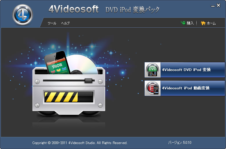 4Videosoft DVD iPod 変換パックは二つのベストなiPod変換ソフトからなっています:DVD iPod変換、iPod動画変換。 4Videosoft DVD iPod 変換パックはDVDをiPodに、DVDをiPod Touch、iPod Nano、iPod Classicに変換します。さらに、DVD をiPhone、Apple TVがサポートするMP4ビデオフォーマットに変換できます。