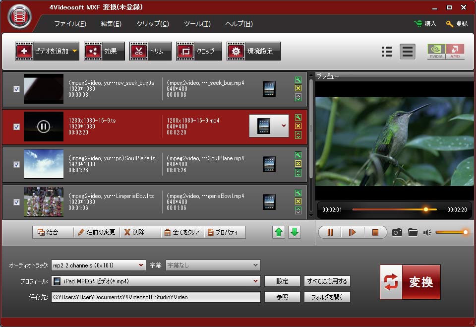 それに、このMXFビデオ変換ソフトは豊富な編集機能を提供します。 例えば、効果(輝度、飽和度、コントラスト、色相)、トリム、クロップ、ウォーターマーク、結合などです。 また、このソフトはNVIDIA® CUDA™とAMD APPの技術を採用して、MXFファイルの変換スピードは6倍速になります。さらに、このMXFファイル変換ソフトは詳細なビデオとオーディオ設定を提供します。例えば、ビデオエンコーダー、解像度、フレームレート、ビデオビットレートとオーディオエンコーダー、サンプルレート、チャンネル、オーディオビットレート。すべてのパラメータを必要に応じて設定、個性的なビデオをカスタマイズ、ソース動画のプレビューおよびスナップショット機能などいろいろな機能も備えています。