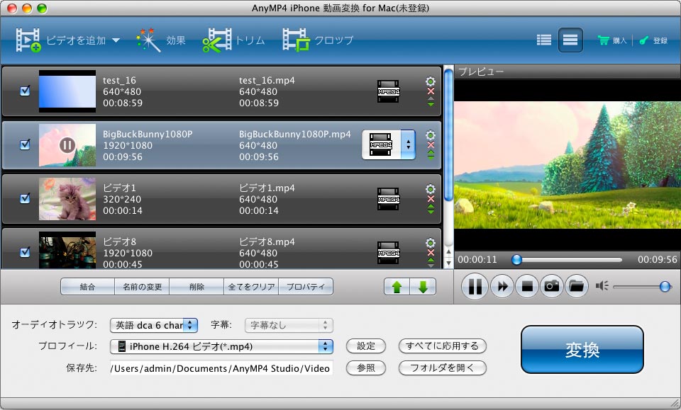 AnyMP4 iPhone 動画変換 for Macは特にiPhoneファンのために開発され、Macシステムで応用されたソフトです。このソフトで、Macで簡単に人気ある動画ファイルをiPhone対応のフォーマットに変換できます。それで、何時でも何処でもiPhoneでお好きなムービーや映像などのビデオファイルを観て、時間と地域の制限が消えてしまいます。本当に助かったプログラムです。