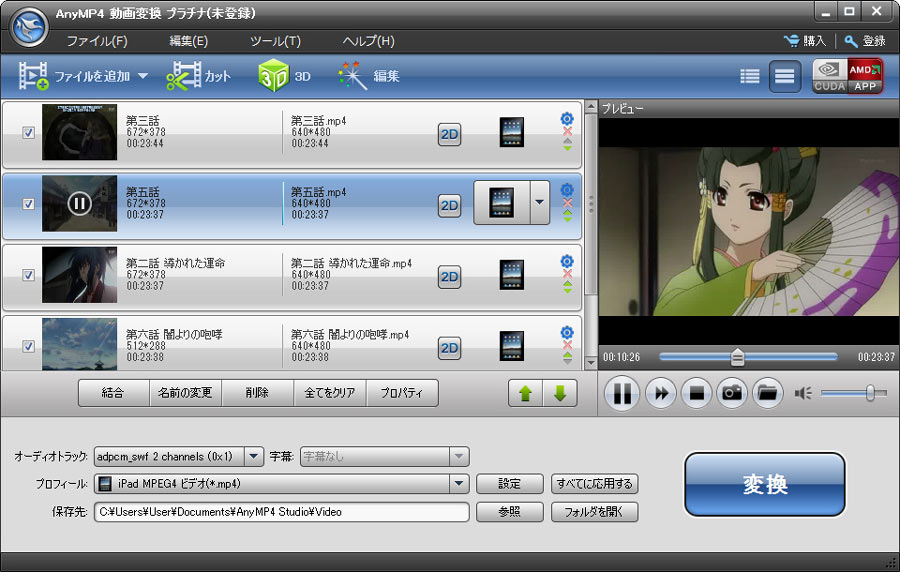 AnyMP4 動画変換 プラチナは専門的な動画変換ソフトウェアで、MP4、MTS、TS、MKV、MOV、FLVとAVIなどを2D或いは3D 動画に制限なし変換できます。2D動画だけでなく、HD TS、HD MTS、HD MOV、HD WMV、HD AVIなどのHD動画を3D動画に変換することも可能です。また、お好みに合わせて、出力3Dモードを選択することもできま す。また、この強力な動画変換ソフトウェアにより、動画から音声ファイルを抜き出し、MP3、AAC、AC3、M4Aなどに無損失で変換することができます。