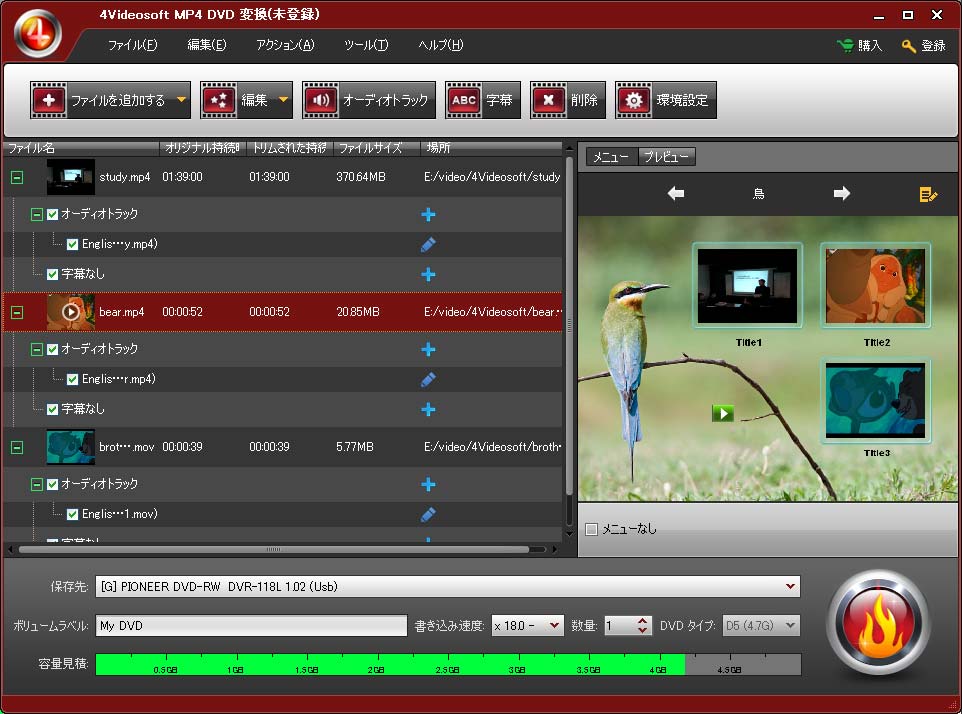 ソフト名称のとおり、4Videosoft MP4 DVD 変換はMP4動画をDVDディスク、DVDフォルダーとISOに変換でき、専門的なmp4 dvd 作成ソフトウェアです。MOV、M4V、MPV、MODなど他の動画ファイルをdvdに書き込むことも可能です。そうして、動画ファイルをdvdプレーヤーで再生することができるようになりました。