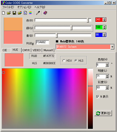 外部カラーテーブル(色見本)は、HTMLColに付属のものと同じものが使えます。また、色見本の編集では、完璧ではないですが Adobe Photoshopの色見本 *.aco ファイルの読み書きができますし、DICデジタルカラーガイドColor Trainの *.cgd も読み込めます。