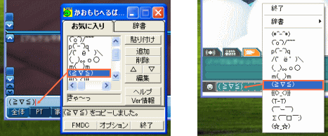 ■使いたい顔文字をダブルクリック(または貼り付けボタンをクリック)するだけで、貼り付けたい場所に自動的に挿入します。